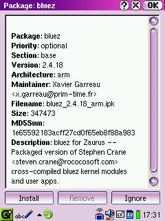 xavier@servor:~/zaurus > ./mkipkg bluez Packaged contents of bluez into ./bluez_2.4.18_arm.ipk