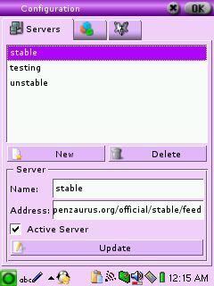 On se rue (en bon geek) sur le menu "Options/Configure". Les trois serveurs d'openzaurus.org sont déjà présents. On clique sur stable, coche la case "Active Server" pour aller chercher des paquets sur ce serveur, puis sur le bouton "Update". On peut renouveler l'opération pour testing et unstable si on est téméraire ou dans le besoin de paquets récents considérés comme non stables. On quitte cette page en cliquant sur "OK".