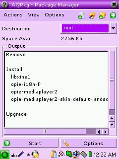 Une fois votre choix fait, cliquez sur "OK" pour installer effectivement les paquets. Le zaurus vous demande où effectuer l'installation (Mémoire interne, Carte CF ou Carte SD) mais énormément de paquets imposent d'être installés en mémoire interne. Choisissez ce que vous voulez mais mettez les paquets dépendants entre eux ensembles et sur un système ext2 pour la préservation des liens. Quittez l'interface d'installation de paquets. Quelques rares installations vous demanderont de rebooter (HancomSheet par exemple), dans ce cas, faites le ...