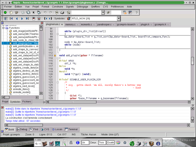 Cet article a pour objectif de vous faire découvrir un EDI (Environnement de Développement Intégré) dont on parle peu, à tort. Je m'adresserai à ceux qui aiment disposer de facilités pour construire leurs programmes tels que la colorisation de syntaxe, la recherche rapide des lignes correspondant aux erreurs et warnings de gcc par simple clic, possibilité de trouver une fonction dans un fichier uniquement en cliquant sur son nom dans un navigateur de code.