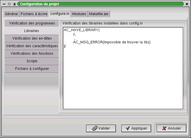 J'espère toutefois vous avoir convaincu qu'anjuta possède les qualités que l'on s'attend à trouver dans un EDI performant. La chose qui manque le plus à anjuta, outre l'intégration des composants annexes, est à mon avis une interface plus conviviale de modification du fichier configure.in. En effet, pour l'instant il vous faudra taper les macros comme vous le feriez de façon classique (mais tout de même dans une fenêtre à onglet, en fonction de la section que vous souhaitez modifier). A titre d'exemple, si vous ajoutez une librairie dans les options de gcc et ld, le test de sa présence sur le système cible devrait être ajouté dans le script configure.in.