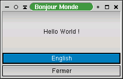 Nous avons connecté le signal clicked du bouton lang_button à la fonction on_lang_button_clicked. Toutefois le premier paramètre de la fonction ne sera pas le bouton mais le label 'message_label' comme c'est le cas quand on utilise la fonction gtk_signal_connect_object. Vous pouvez consulter le code à la fin de la fonction create_bm_fen du fichier interface.c.