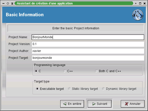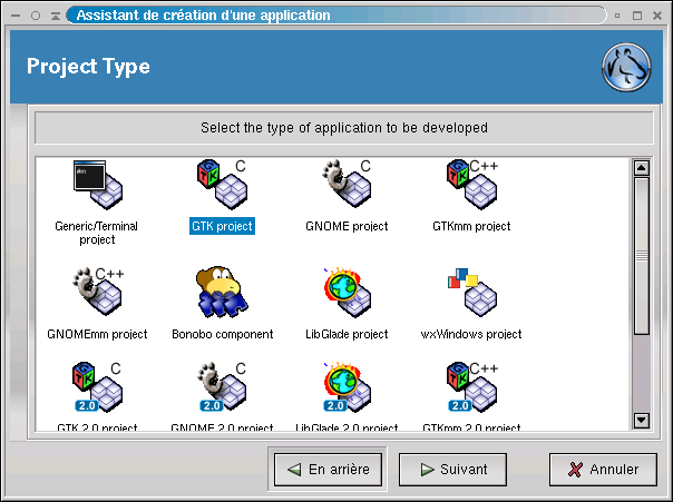 3. Dans l'assistant, cliquez sur 'Suivant' et choisissez GTK Project (l'internationalisation n'est pas terminée et toute contribution est la bienvenue) puis recliquez sur 'Suivant'