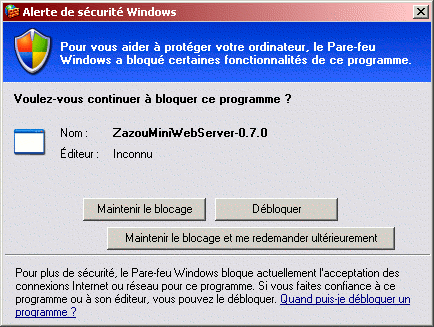 - Vous devez avoir une fenêtre telle que celle ci-dessous. Cliquez sur "Débloquer". Cette alerte est due au fait que le parefeu de windows est activé par défaut à partir de XP SP2. ZazouMiniWebServer doit être autorisé à accepter les connexions