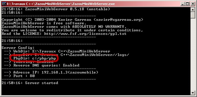 à ZazouMiniWebServer où le trouver (à moins de l'installer dans c:\php ou c:\php5). Pour celà, utiliser l'option en ligne de commande -phppath chemin